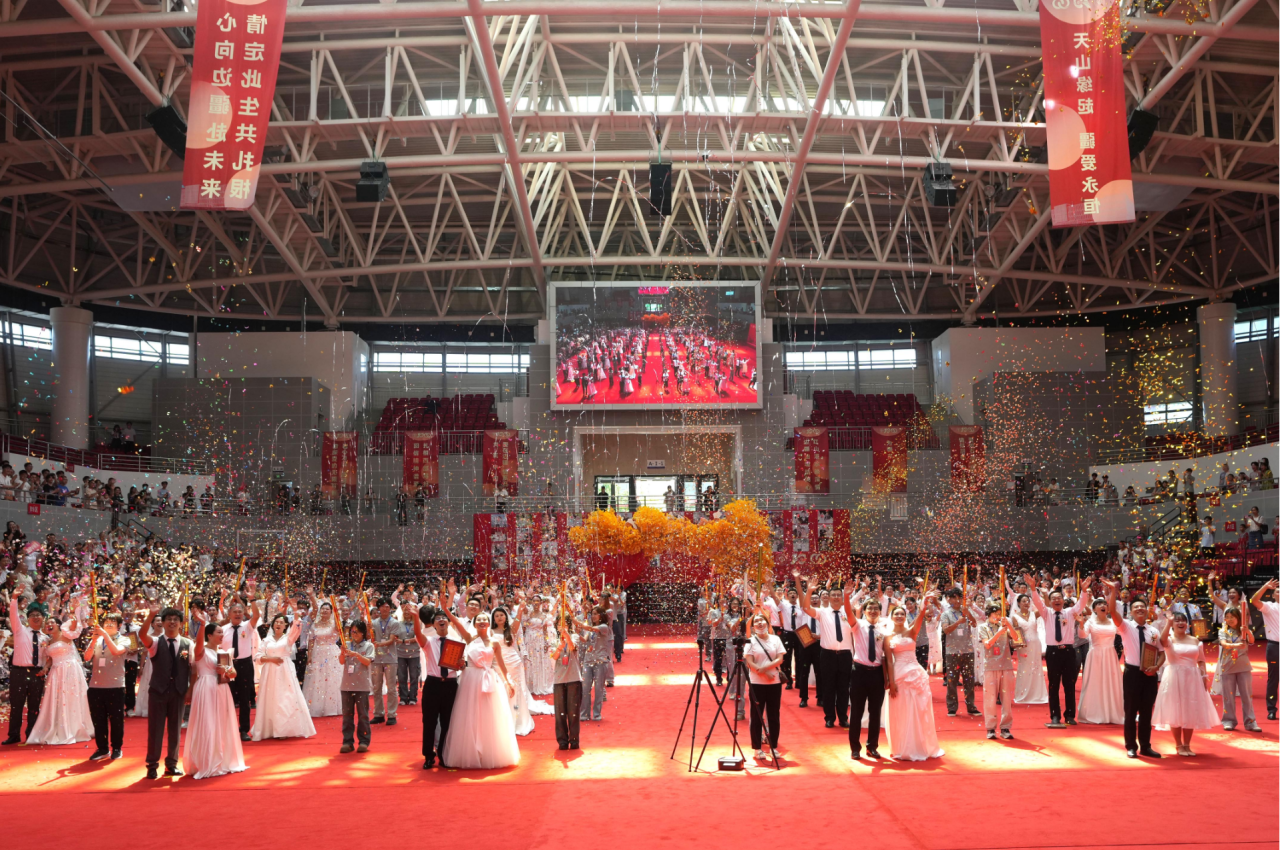 6月28日,“天山缘起 疆爱永恒”情牵beat365集体婚礼在克拉玛依校区红山湖体育馆举行,55对在新疆这片热土建功立业并喜结良缘的伉俪重返母校,共同举行结婚典礼。