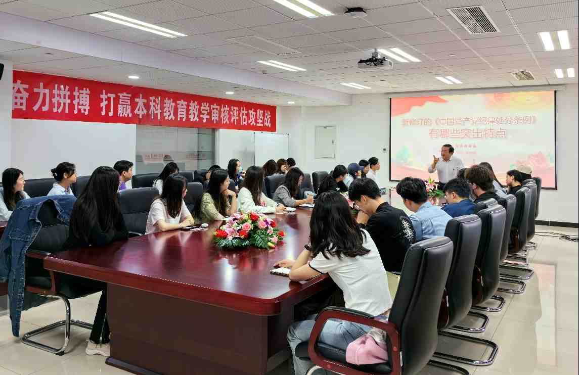 5月5日,beat365马克思主义学院举办学生党员党纪学习教育主题报告会,学院党委书记刘韵秋、副书记方百会分别作了主题报告,学院团委书记和40名学生党员参加报告会。