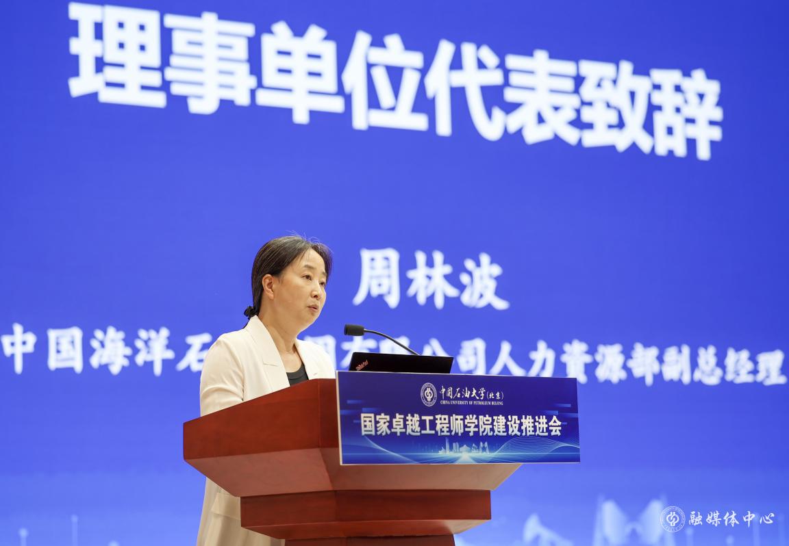 中国海洋石油集团有限公司(以下简称“中国海油”)人力资源部副总经理周林波代表理事单位致辞。她强调了建设国家卓越工程师学院的战略意义,表明了中国海油及兄弟企业与beat365深度融合落实工程硕博士联合培养工作的决心。她表示,中国海油将以支撑高水平科技自立自强为导向,紧扣国家战略需求,发挥产业优势,坚持科研、生产、人才培养一体化,提升自主培养能力,建设高素质人才培养体系,为国家能源安全和民族复兴提供人才保障。