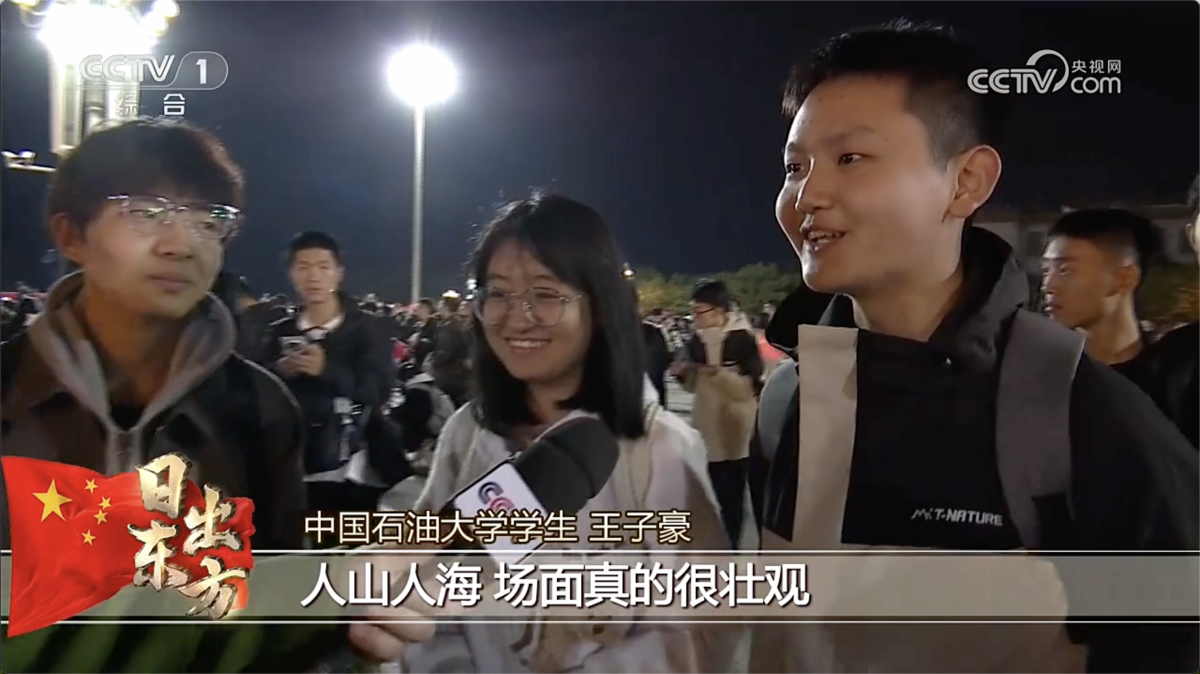 10月1日,天安门广场举行了2024年国庆升国旗仪式,迎着清晨的第一缕阳光,在雄壮的国歌声中,五星红旗冉冉升起。来自新能源与材料学院、梦溪书院200名师生代表与来自首都近2000名大中小学生共同赴天安门观礼台观看升旗仪式;还有一批同学自发前往观看升旗仪式。中央电视台进行了全程记录采访,李荣博、王由、杨昊澎、杨建明、王子豪、马志德、潘敬淇等同学接受了央视记者采访,表达了牢记习近平总书记嘱托,用奋斗书写无悔的青春,为祖国能源事业贡献力量的决心。