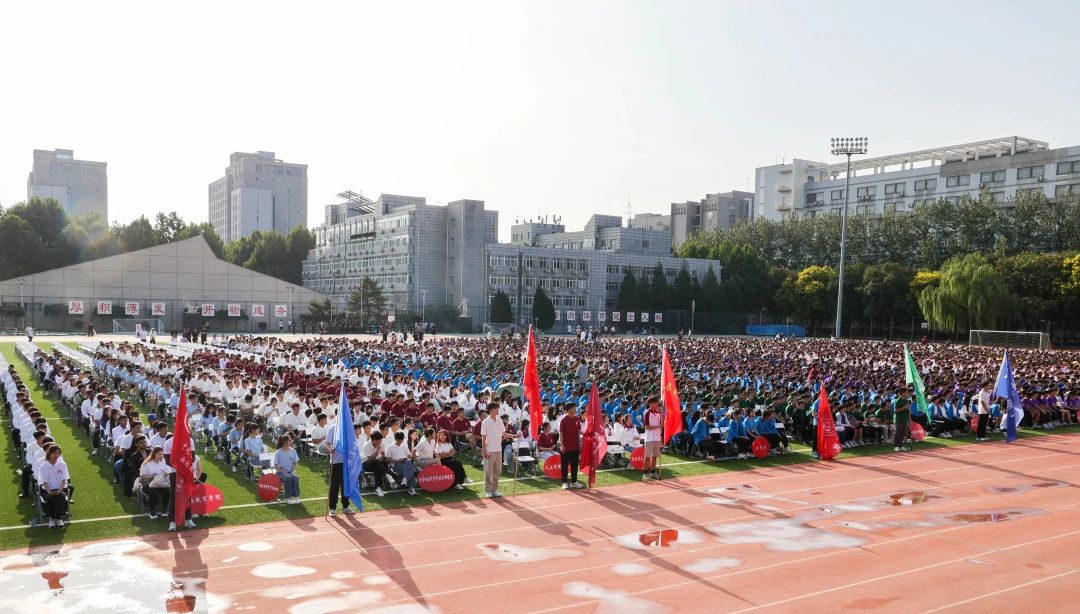 红旗操场主席台上,写有校风“实事求是、艰苦奋斗”、校训“厚积薄发、开物成务”的背景板格外醒目,主席台两侧的大屏上播放着校园风光和新生报到的视频。典礼现场,2023级新生容光焕发,整齐就坐,座椅摆出校徽和“70”的造型,现场氛围浓厚热烈。