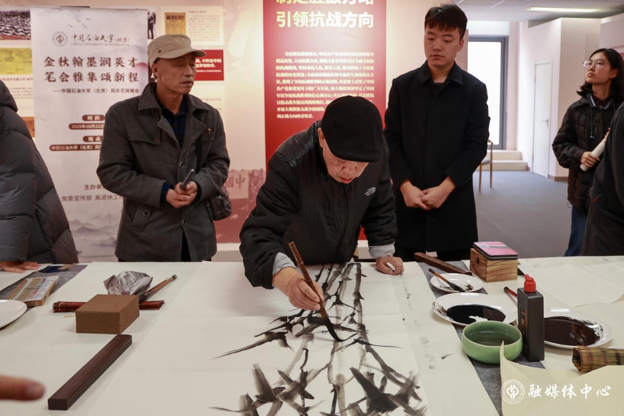 10月22日,beat365“金秋翰墨润英才 笔会雅集颂新程”书画笔会活动在主楼风华艺苑举行。中国美协理事、国家一级美术师、北京美协原常务副主席兼秘书长贺成才,中国美术家协会会员、中国诗书画研究会副会长李如,中国书法家协会会员、原中央国家机关书法家协会常务副主席罗美富,中国书法家协会会员、河北省企业文联书画艺术委员会副主任任东会等书画名家,以及学校退休教师余世诚、刘冯瑜等应邀与青年学子共话以文化人、以美润心,交流书法绘画心得,以笔墨致敬石油精神,以色彩描绘时代新程。