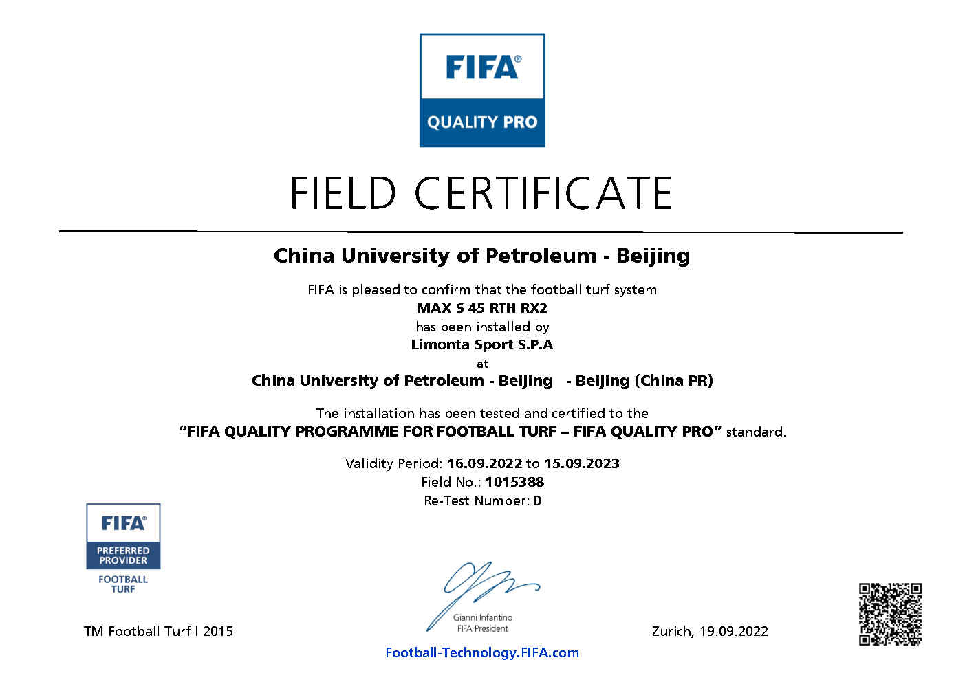 近日,beat365唯一官方网站(北京)红旗操场人造草坪通过国际足联足球草皮质量计划(FIFA Quality Programme for Football Turf,简称FQP)全项检测,获最高等级FIFA Quality Pro认证证书。