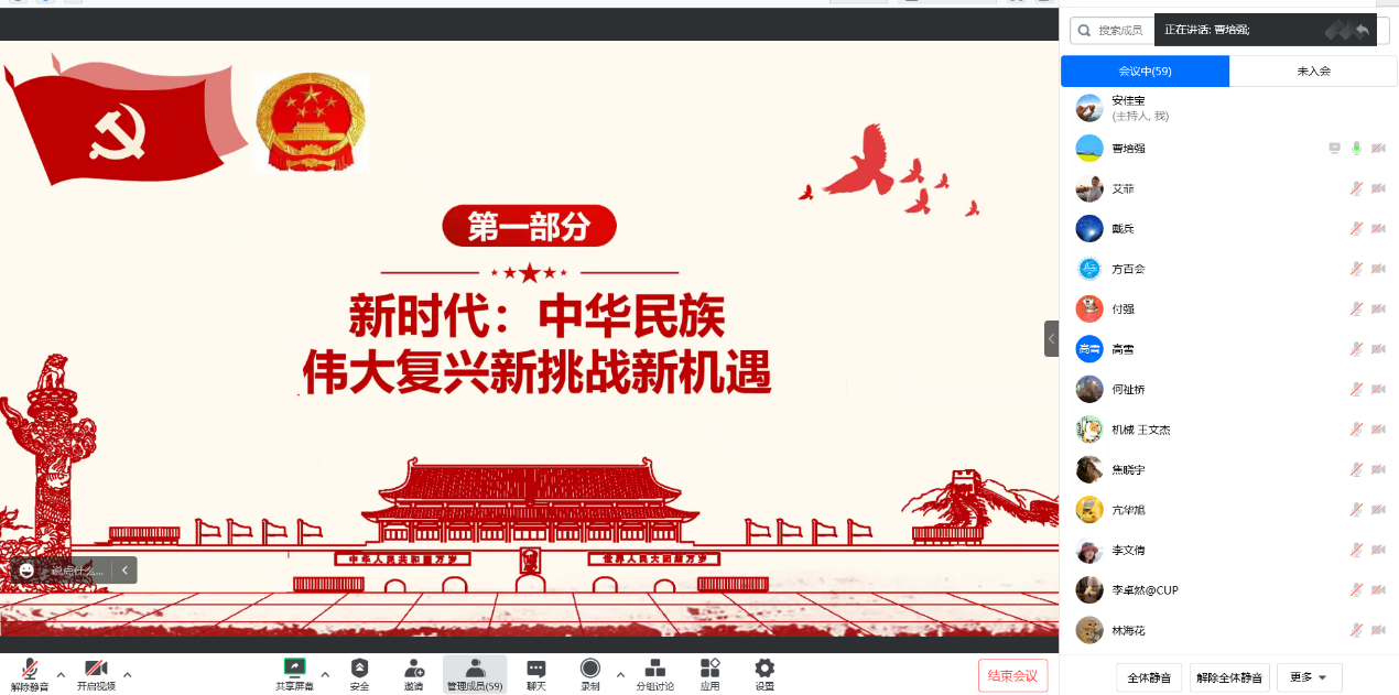 马克思主义学院曹培强教授作了题为“为了中华民族的伟大复兴——党的二十大精神解读”的专题报告。曹培强从对“民族”一词的解读入手,围绕“新时代:中华民族伟大复兴新挑战机遇”“新布局:中国式现代化的‘能源格局’”“新征程:中华民族伟大复兴的青年新局”三个方面展开系统阐述。报告语言生动、事例鲜活,对于大家深刻学习领会习近平总书记关于加强和改进民族工作的重要思想,不断深化对铸牢中华民族共同体意识教育重要性和必要性的认识提供了启发和借鉴。