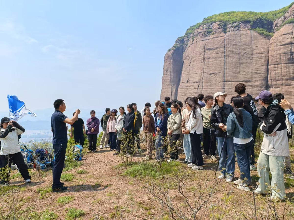 在亚洲第一大单体岩石——赤城县后城镇赤壁丹霞地貌区,“精铸匠心”开发地质导学团队党支部充分发挥“双带头人”作用,师生联合将地质教学路线与党建活动紧密结合。地球科学学院副教授吴欣松以丹霞地貌为“天然教材”,现场讲授岩层构造与沉积演化,生动诠释了地球衍变的“沧海桑田”故事。“精铸匠心”党支部书记刘钰铭现场开展微党课教学,结合全球丹霞地貌分布,阐释中国地质资源的独特性与保护意义,引导学生要从生态文明保护的角度构建“人类命运共同体”。体育教研室党员唐亮、朱静则利用野外生存课程专业知识同步指导师生在陡峭地形中科学行进,将“地质探索”与“生存实践”深度融合。学生通过分组研讨,从岩层特征反推古地理环境,在协作中提升解决实际问题的能力。