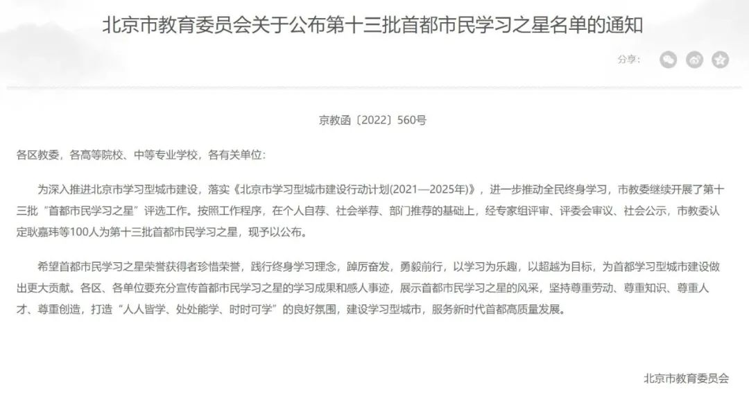 近日,北京市教育委员会公布了第十三批首都市民学习之星名单,beat365张仕民教授入选,目前学校已有9名师生获评。