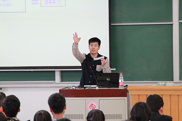讲座上,张虎以自己丰富的创业经历,引出“创业”与“就业”的概念,与同学们探讨了“毕业后选择创业还是就业”的问题。他从生活方式、精神状态等19个方面讲述了打工者与创业者的不同,通过“诸葛亮找工作”等三个故事讲述了信息采访与收集、拓展交际圈、锁定目标和主动出击四个求职步骤,并勉励大家要直面挑战、坚持到底。他还以 “时间纸”小活动告诫大家要珍惜短暂的大学时光。讲座在“爱的鼓励”掌声小游戏中结束。