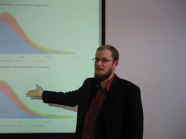 本次会议上,Mikael Hook博士介绍了他对全球煤炭资源的研究成果,认为全球煤炭资源很难持续百年,中国的煤炭峰值可能在不远的将来来临,煤炭资源不是缓解石油峰值问题的方案。代世峰教授介绍了中国煤炭资源的成藏过程、地理分布及资源品质情况。丁日佳教授介绍了中国煤炭工业现状、中国煤炭工业面临的形势、中国煤炭工业发展的主要任务以及中国煤炭需求的预测方法。与会代表一致同意在煤炭峰值问题上应加强研究,并探讨了今后进一步合作和交流等事宜。