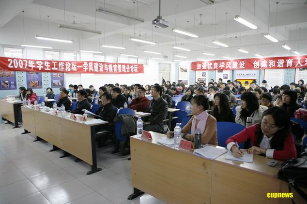 2007年12月14日,我校学生工作论坛学风建设与教育管理分论坛在三教206教室成功举办。该论坛由化学科学与工程学院和外语系共同承办,论坛主题是“加强优良学风建设,创建和谐育人环境”。张来斌校长、徐春明副校长出席,研究生院、人事处、学工处、就业指导中心、团委、化工学院和外语系等单位领导参加了此次论坛。