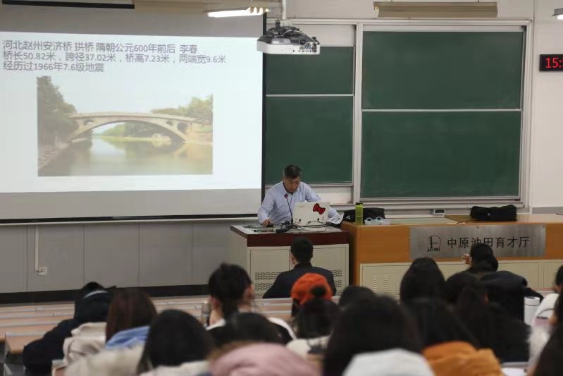 张恩龙向现场师生介绍了我国古代桥梁和现代桥梁的桥梁型式、用途以及桥梁建设所采用的材料等,详细阐述了我国桥梁的发展历程和未来。通过此次讲座,同学们加强了对桥梁建设的认识,了解到我国在桥梁工程方面取得的巨大成就,进一步坚定了“四个自信”。