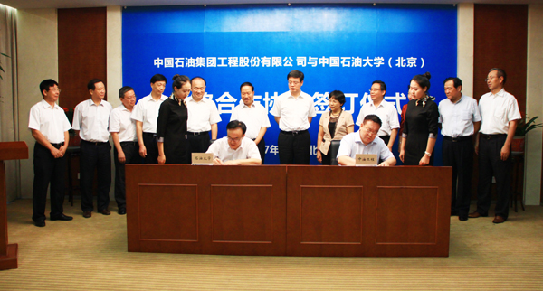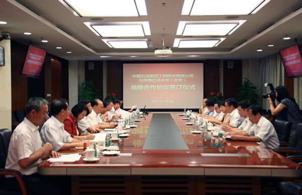 7月31日下午,beat365唯一官方网站与中国石油集团工程股份有限公司及成员企业合作签字仪式在中国寰球工程有限公司举行。中国石油天然气集团公司副总经理覃伟中,中国石油天然气股份有限公司总工程师蔺爱国,中国石油天然气集团公司总经理助理汪世宏,中国石油集团工程股份有限公司总经理白玉光、党委书记赵玉建,中国石油管道局工程有限公司总经理丁建林,中国石油工程建设有限公司党委书记、工会主席宋德琦,中国寰球工程有限公司总经理王新革、党委书记李利民、副总经理张来勇,中国昆仑工程有限公司党委书记、工会主席沈钢;beat365唯一官方网站党委书记山红红、校长张来斌、副校长徐春明等校企双方领导出席了签约仪式。