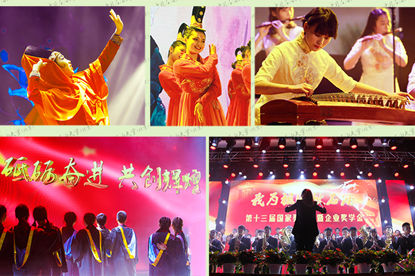 颁奖典礼在一曲气势恢弘的管弦乐合奏《红旗颂》中拉开帷幕。多才多艺的石大学子表演了汉唐舞《盛世欢歌》、民族管弦乐合奏《丝绸之路》、现代舞《青春的脚步》、音诗画《青春石油梦》、小品《石油人的风采》、大合唱《我和我的祖国》等节目,展现了在党的十九大精神的指引下,石大学子汇聚青春正能量,奋勇实现石油梦、中国梦的时代担当。来自克拉玛依校区的8名学生表演了民族舞《买西来普—玛依姑娘》,充分展现了克拉玛依校区的学生风采。颁奖典礼在《我为祖国献石油》的歌声中落下帷幕。