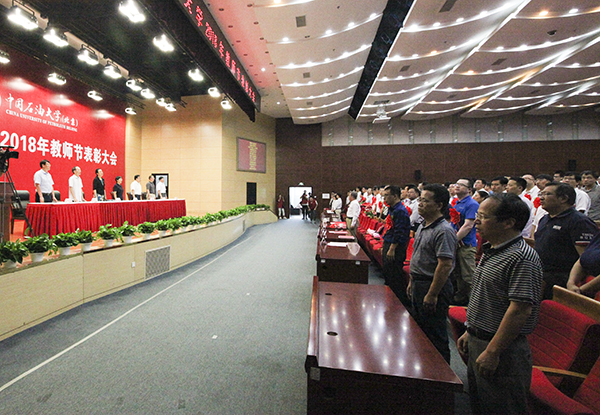 中国工程院院士沈忠厚,中国科学院院士王铁冠,校领导山红红、张来斌、吴小林、雷玉江、鲍志东、李根生、韩尚峰与全体二级干部、获表彰教师代表、新入职教师代表、学生代表近700人欢聚一堂,共同见证石大教师的光荣时刻。校长张来斌主持大会。