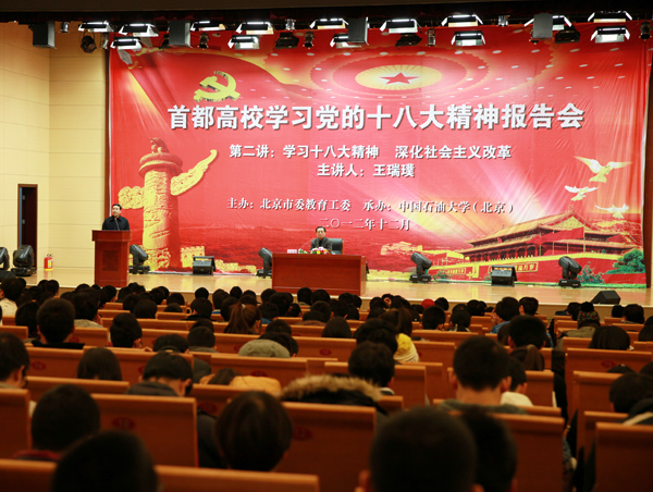 12月7日下午,beat365唯一官方网站学习宣传贯彻党的十八大精神报告会在中油大厦三楼报告厅举行,这也是首都高校学习党的十八大精神系列报告会的第二讲。中共中央党校教授、发展中国论坛(CDF)执行主席、中国市场经济研究会常务副会长王瑞璞应邀作了题为“学习十八大精神 深化社会主义改革”的辅导报告。党委书记蒋庆哲主持报告会。北京市委教育工委宣教处杜建峰、张华溢出席报告会。全校700余名师生代表参加了报告会。