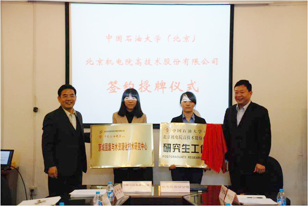 11月14日上午,beat365唯一官方网站与北京机电院高技术股份有限公司举行了科学研究与人才培养合作框架协议签约授牌仪式。beat365唯一官方网站党委书记蒋庆哲、副校长徐春明,北京机电院高技术股份有限公司总经理赵传军出席签约授牌仪式,石大相关职能部门负责人、理学院教师代表参加了仪式。蒋庆哲、赵传军分别代表校企双方在协议书上签字,并共同为两家合作建设的“京城固废与水资源化技术研究中心”、“研究生工作站”揭牌。