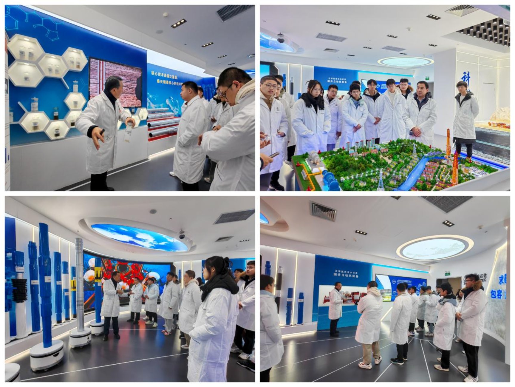 交流结束后,师生们来到了工程院的实验中心,科技服务支持中心副经理邓大伟担任讲解员,向师生一行介绍了实验中心的各个实验室以及于此处拼搏的中国石化优秀创新团队。接下来,邓大伟带领大家来到了科技展厅。在这里同学们见到了诸如“无限极循环平衡式尾管悬挂器”、“无限极全通径滑套”、“随钻近钻头伽马成像仪器”等大量中石化科技攻关产品;听到了为降低环境影响而提出的“新能源解决方案”;感受到了中石化“求是、开放、包容、协作”的科创精神。
