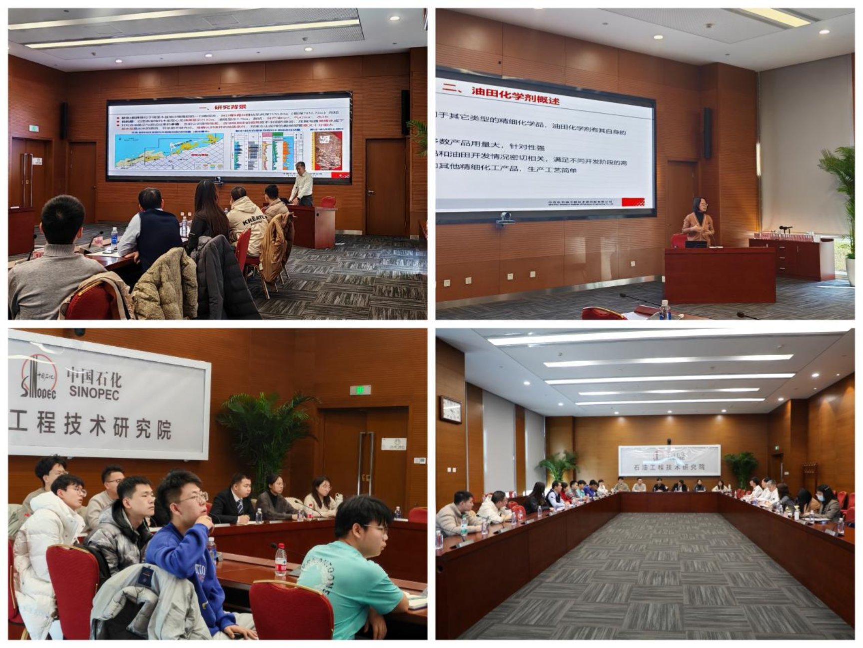 抵达工程院的第一站,师生们来到了科研楼会议室。在这里,大家观看了工程院宣传片,张志昂介绍了工程院的发展历史、人才队伍、平台建设、科学研究、组织架构等基本情况。随后,王志战和钱晓玲两位专家先后主讲了两场学术微讲座。讲座分别以“新北1斜井复杂储层地质工程一体化”、“油田化学剂”为切入点,带领同学们走近工程实际问题,了解行业发展现状。讲座结束后企方代表与师生进行了深入交流,耐心解答了同学们提出的各类问题,向同学们介绍了企业专业实践环节的师资配备、合作机制、学习生活保障、就业等情况。