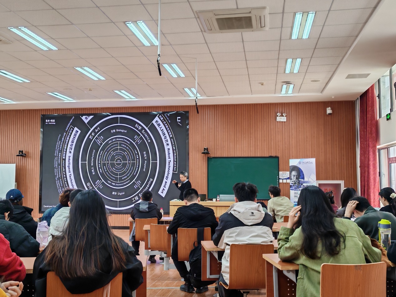 费教授从科技与艺术的关系图式开讲。提出了一个基于艺术、设计、科学、工程四个关键词的跨学科系统,并深入剖析了“跨学科”在设计领域的重要性。随后,费教授以《虫舱》、《模仿游戏》、《水曰》、《微言》等作品为例,带领大家直观感受了艺术与生物科技、机器人科技、数据科技、智能科技的跨学科实践。最后,《EAT ART·MR情绪料理》、《情绪几何》等作品的展示则让同学们愈发理解了费教授 “艺术不仅为科技提供灵感,科技也为艺术展现无限可能”的理念。