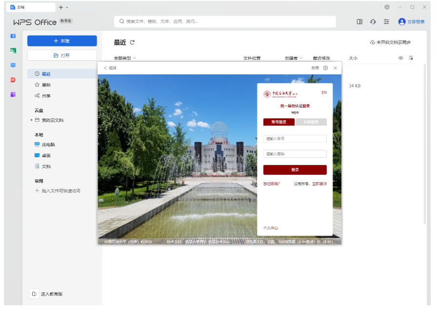 (1)通过正版化平台或专属下载页面下载打开WPS客户端,点击右上角“立即登录”;进入beat365唯一官方网站(北京)统一身份认证界面,输入账号密码即可登录使用。
