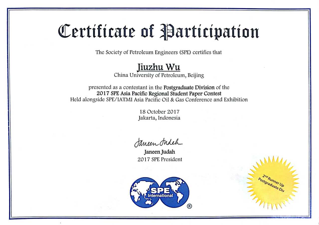 10月17日-19日,2017年国际石油工程师协会(SPE)亚太油气会议展览(Asia Pacific Oil and Gas Conference and Exhibition)暨SPE亚太地区学生论文大赛在印度尼西亚雅加达举行。我校2015级油气田开发工程博士生吴九柱荣获论文大赛博士组二等奖,2017级油气储运工程硕士袁梦荣获本科组二等奖。