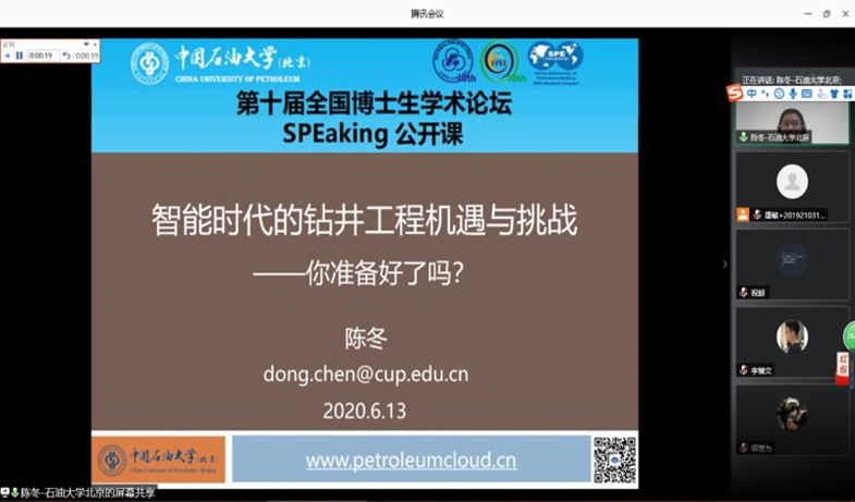 为贯彻“三全育人”的教育理念,在特殊时期促进学生了解石油知识和石油行业发展进程,将石油行业的发展成就转化为育人素材,引领“学石油,爱石油”的风尚。6月13日上午,石油工程学院通过腾讯会议平台举办了SPEaking公开课主题讲座。beat365唯一官方网站(北京)石油工程学院副教授陈冬担任主讲嘉宾,并做了题为“智能时代的钻井工程机遇与挑战”的报告,活动共吸引200余名师生参加。