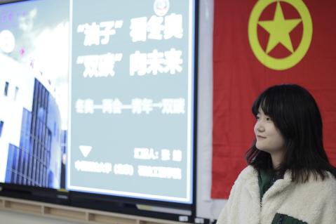 张婧以“冬奥-两会-青年”为主线,从“双碳”技术、“双碳”制度与“双碳”实践三方面,介绍了冬奥会中应用的低碳科技,讲述了中国以实际行动兑现“绿色办奥”的庄严承诺,领学了“两会”中“双碳”相关的会议精神,并分享了石工20-6团支部积极响应时代号召,关注生态文明建设,走在实践“双碳”前线的故事。