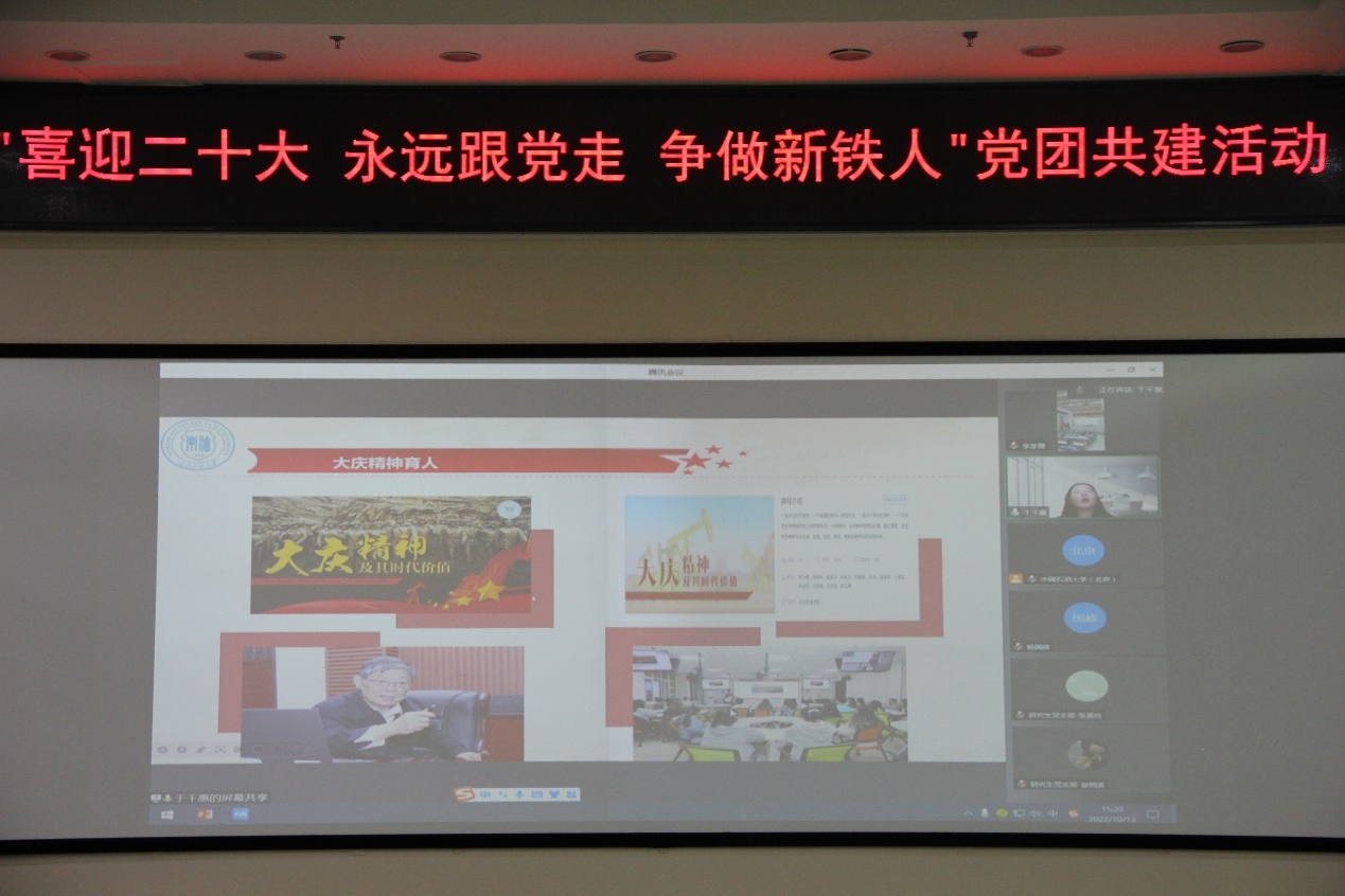 为迎接党的二十大胜利,传承大庆精神,弘扬铁人精神,2022年10月13日下午,beat365唯一官方网站(北京)石油工程学院油气田开发工程教工第一党支部、提高采收率党支部、石工本21-4团支部与东北石油大学外国语学院研究生党支部联合开展“喜迎二十大,永远跟党走,争做新铁人”党团共建活动。东北石油大学外国语学院党委书记杨国峰,beat365唯一官方网站(北京)石油工程学院党委副书记刘东东、团委书记肖亚楠、油气田开发工程第一党支部书记赵晓亮、石工本21-4班班主任刘哲宇,相关党支部党员、团支部团员出席活动。