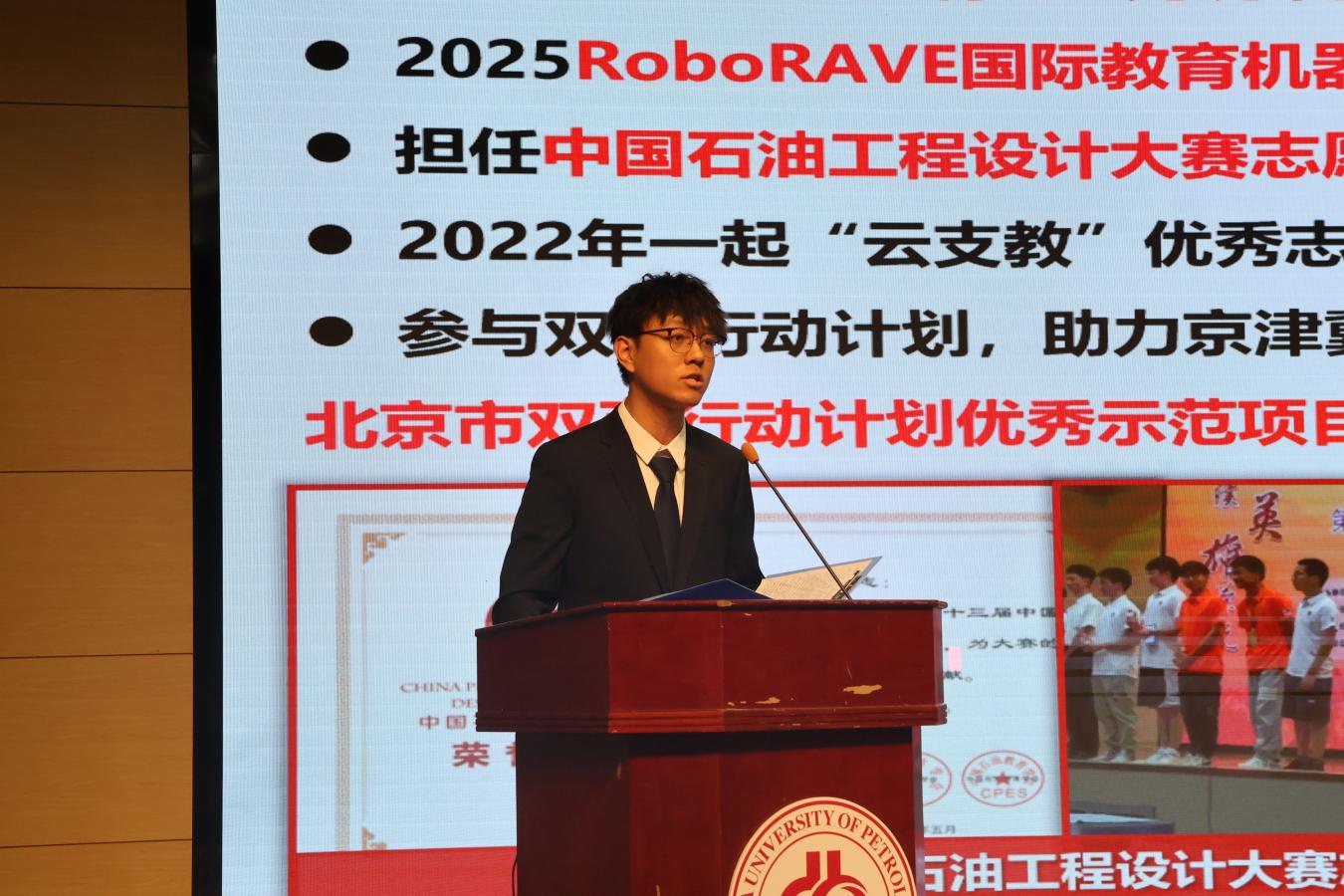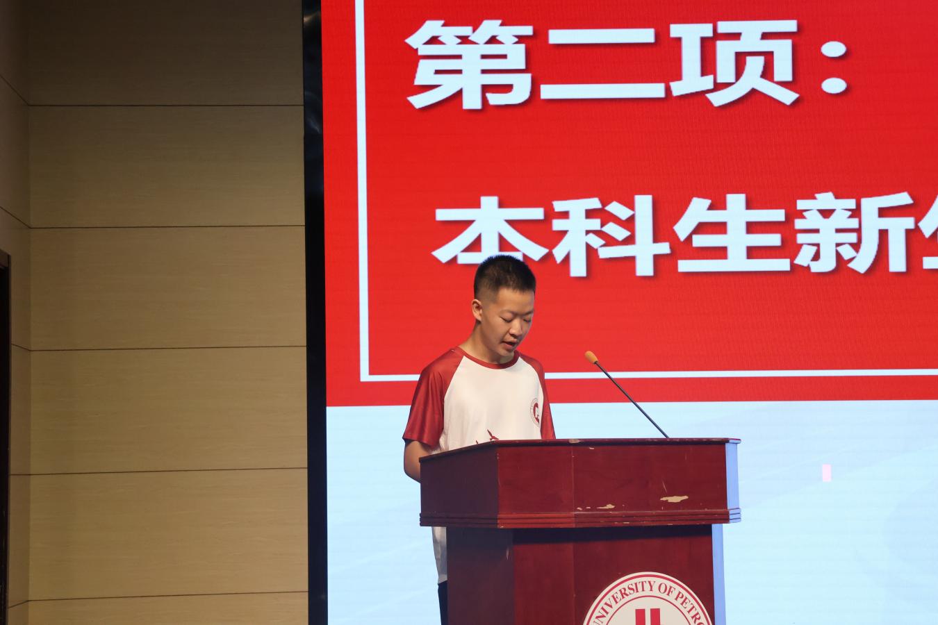 2022级本科生张泽驿作为朋辈辅导员代表发言。他分享了本科三年的学习、科研、实践、社会工作经验,勉励同学们坚持对理想的不懈追求、躬耕自己的精神田园,并祝愿大家在beat365石油工程学院绽放最美的光彩。