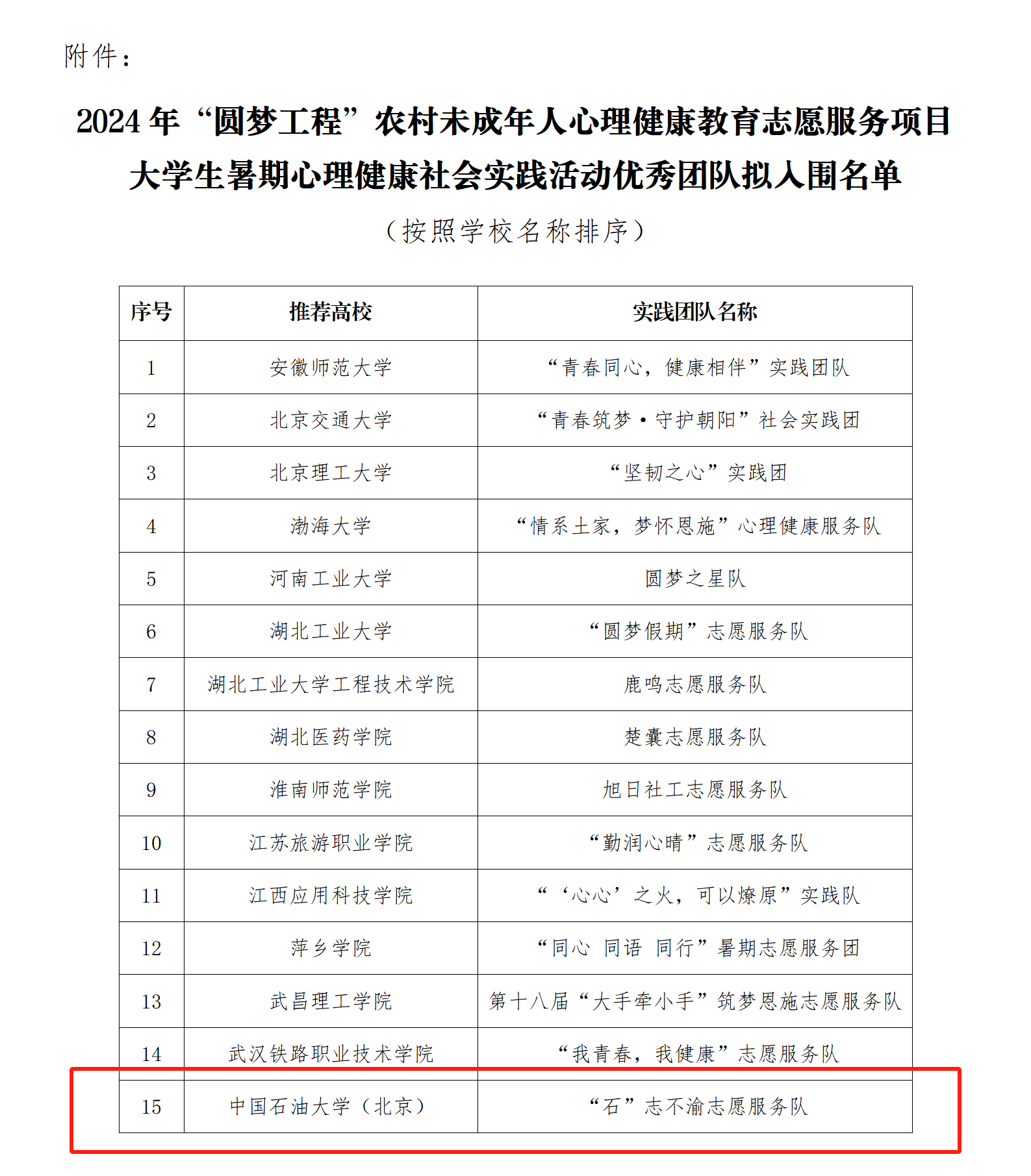 2024年“圆梦工程”农村未成年人心理健康教育志愿服务项目大学生暑期心理健康社会实践活动由中央宣传部文明培育局、中国社会工作联合会主办。经资格审查、专家评选、结果复审等环节,最终评选出全国15支优秀团队,“石”志不渝志愿服务队成功入选。