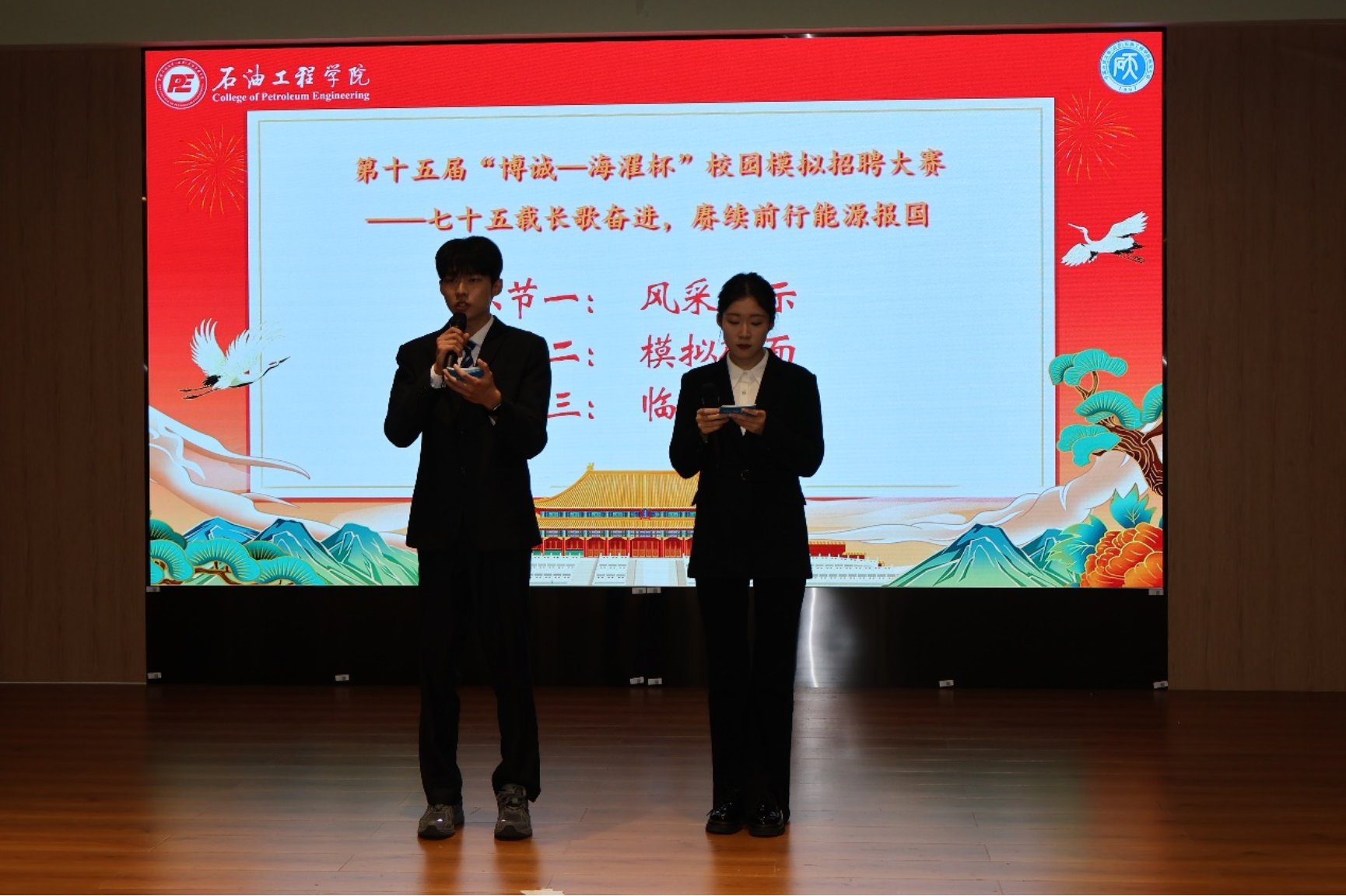 本次大赛以“七十五载长歌奋进,赓续前行能源报国”为主题,由共青团beat365唯一官方网站(北京)石油工程学院委员会主办、石油工程学院研究生会承办,得到了北京石大博诚科技有限公司和陕西海濯能源有限公司的联合赞助。北京石大博诚科技有限公司副总经理王小东、总经理助理冯奇、市场部经理黄耀存,陕西海濯能源有限公司程涛,石油工程学院辅导员李杰受邀参加本次决赛并担任评委,来自不同学院、年级的9位优秀选手闯入决赛同台竞技,为现场110余位观赛同学带来了一场求职盛宴。