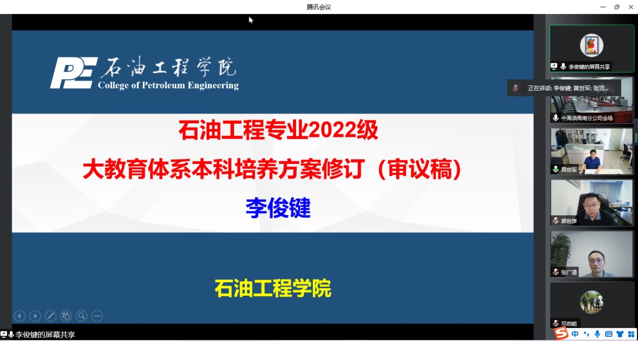 石油工程专业负责人李俊键向参会人员汇报了2022级石油工程专业培养方案修订情况。石油工程学院把思政教育、行业特色、绿色智能、实践创新融入德育、智育、体育、美育和劳育各环节,贯穿大学教育教学各个阶段、覆盖全部学生,促进全体学生品德、知识、能力、素质全面发展,构建相互融合、相互促进的育人体系。
