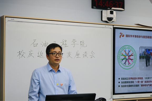 黄世军最后总结,再次欢迎各位校友在校庆70周年之际能齐聚一堂,共忆石工故事,感谢广大校友关心和支持学院发展,希望校友们能继续为学院和学科的高质量发展建言献策,为建设能源领域特色鲜明的世界一流研究型大学不断贡献力量。