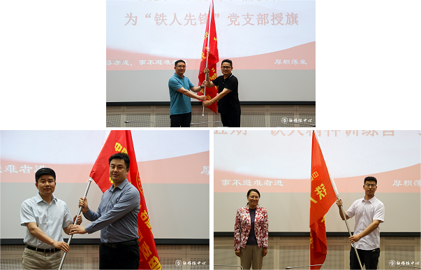 刘东东宣读了关于成立“铁人先锋”党、团支部的决定。党委组织部常务副部长蒲俊霖、校团委书记周学智分别为“铁人先锋”党、团支部授旗。党委宣传部常务副部长李丽平为第五期“铁人精神训练营”授旗。