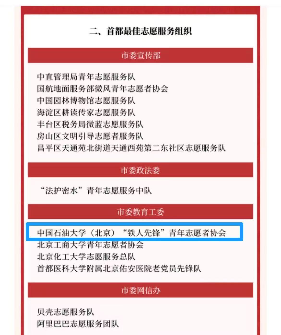 近日,由市委社会工作部、市委宣传部(首都文明办)等26个部门共同组织开展的2024年度首都志愿服务“四个100”先进典型名单公布,学院“铁人先锋”青年志愿者协会成功入选“最佳志愿服务组织”。
