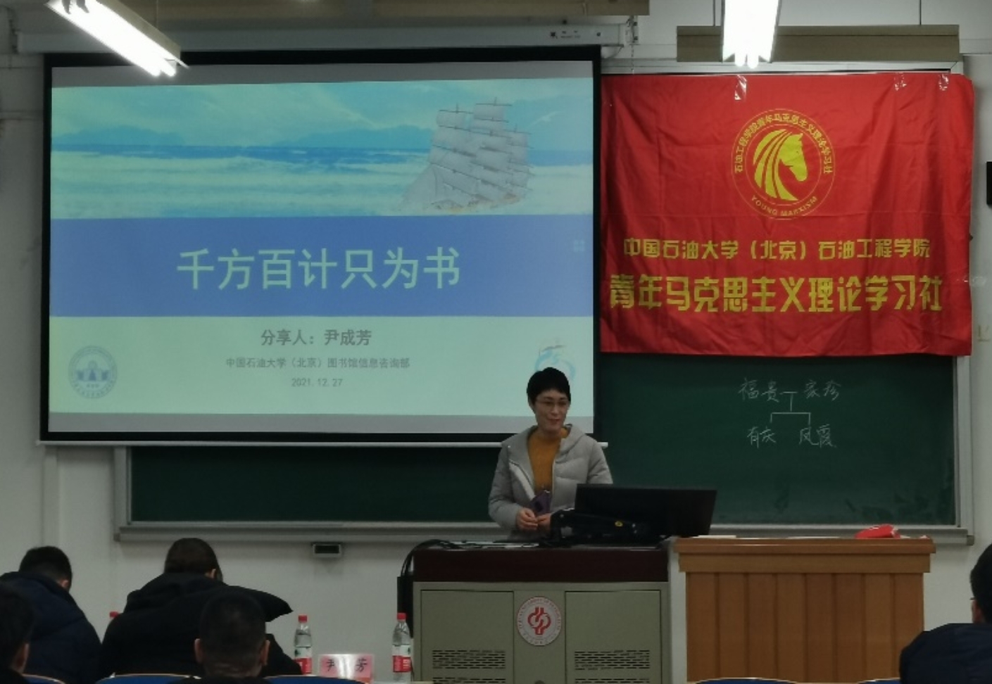 2021年12月27日晚,石油工程学院2021年书香石工总结仪式成功举行。本次活动旨在对书香石工活动进行总结和表彰,并邀请校图书馆尹成芳老师做《千方百计只为书》讲座,由石光工作室部长梁天成主持。参与本次活动的嘉宾有校图书馆负责图书推广的尹成芳、卜晶晶老师,石油工程学院团委副书记李杰、2021级辅导员王心贺。