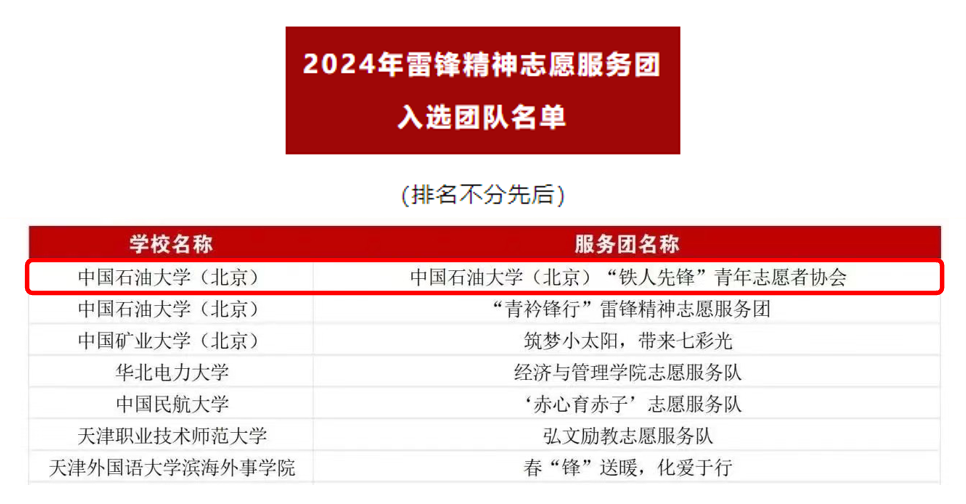 本次活动得到了各高校志愿服务团队的广泛关注和积极参与。主办单位对所有申报材料进行了认真审阅,最终遴选出来自beat365唯一官方网站(北京)、南京大学、郑州大学、华北电力大学等206所高校的240支大学生志愿服务团队。beat365唯一官方网站(北京)“铁人先锋”青年志愿者协会成功入选!