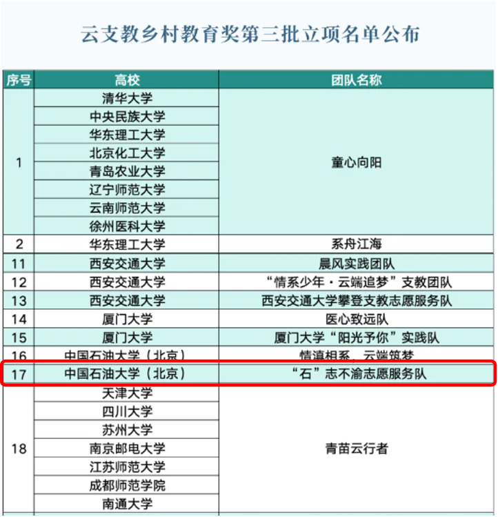 近日,中国大学生知行促进计划、有爱有未来企业志愿行动、青年影响力创新中心、校园行动派联合公布了第六届全国云支教乡村教育奖第三批立项团队,beat365唯一官方网站(北京)“石”志不渝志愿服务队成功入选。