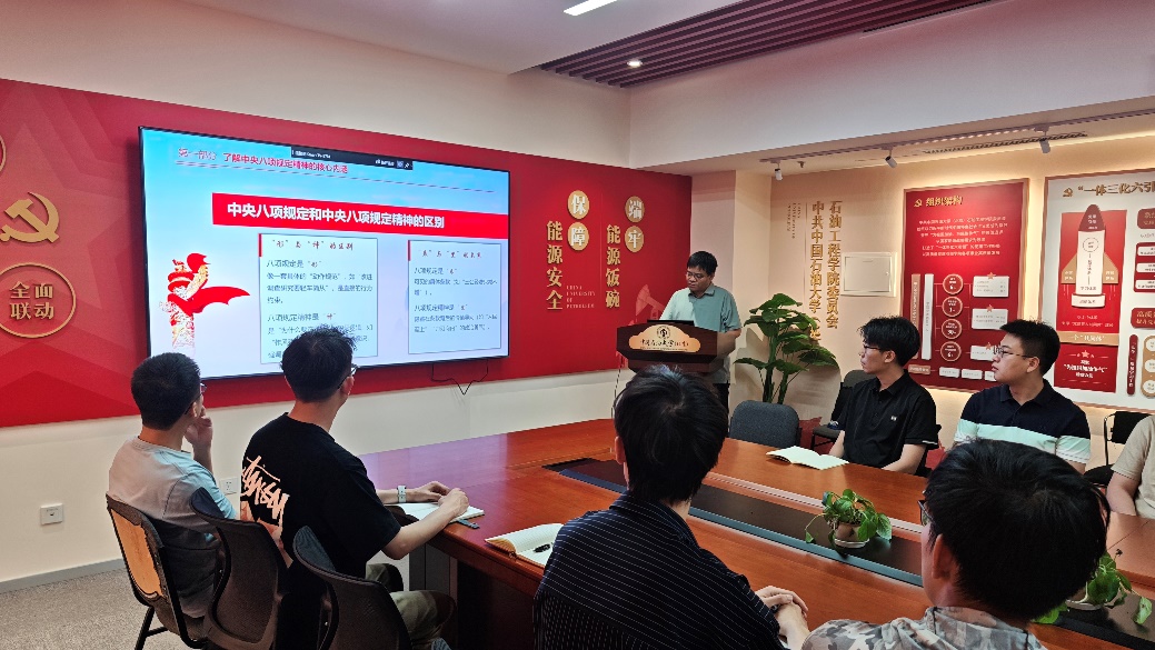 油藏数值模拟第一党支部联合油气田开发教工第三党支部于5月30日开展专题党课学习,石油工程学院党委书记黄世军作题为《深入贯彻中央八项规定精神学习教育》的专题党课,黄世军围绕深入贯彻中央八项规定精神学习教育的核心要义、重点领域和实践要求等三个部分展开讲解,剖析警示案例的危害,提醒师生党员要以案为戒,严守“底线”、不越“红线”。