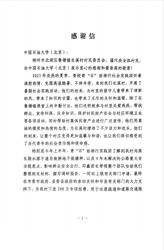 近日,湖南省郴州市北湖区鲁塘镇长溪村村民委员会向学校发来感谢信,对石油工程学院“青”石助湘行社会实践团到长溪村开展社会实践提出表扬和感谢。来信肯定2023年实践团怀着满腔热情,克服高温酷暑,来到长溪村开展了暑期社会实践活动,为当地留守儿童带来了清新的风,带来了知识的甘露,也带来了无尽的关怀和温暖,同时帮助村集体民宿产业进行广泛宣传。特别感谢的是今年上半年,实践团了解到长溪村沟渠长期水源不通导致耕地不能播种和4年未解决的公路重大安全隐患点,影响群众安全出行,协助长溪村整理相关材料,撰写调研报告,一同向上级有关部门申请,最终在郴州市委市政府、北湖区委区政府的亲切关怀和市区有关部门的大力支持下,为长溪村下发了200万专项经费,用于水渠疏通和道路交通隐患点改造,及时为长溪村老百姓解决了稻田灌溉及交通安全出行等问题。