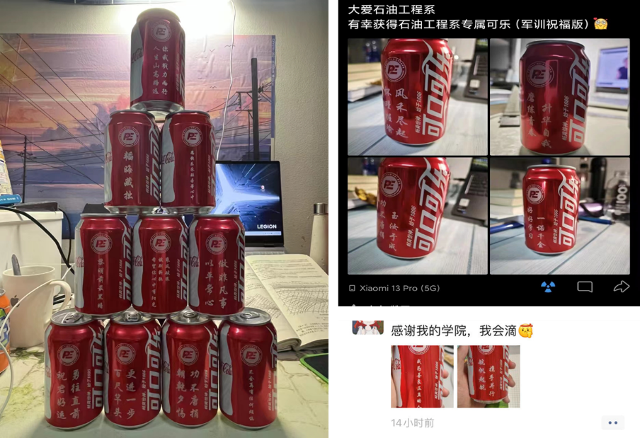 此外,学院还为所有2023级新生发放了精心准备的“定制可乐”,在可乐瓶身加印“送给彼此的金句”,金句不乏鼓舞、祝福、期许相关内容。定制可乐的设计,让参学生在训练中体味到一丝惊喜。