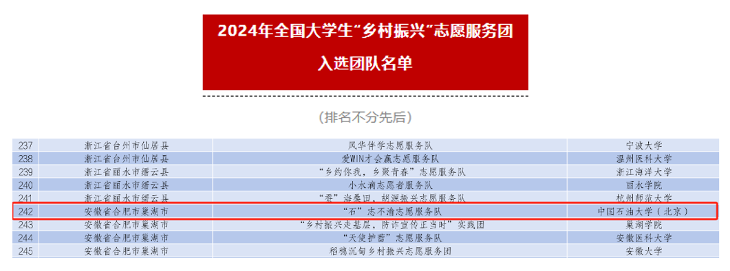 近日,中国青年志愿者公布了2024年全国大学生“乡村振兴”志愿服务团入选名单,beat365唯一官方网站(北京)石油工程学院“石”志不渝志愿服务队成功入选。这也是该团队第二次入选团中央“乡村振兴”志愿服务专项,并获得团中央2023年全国大学生“乡村振兴”优秀团队(全国100支)。