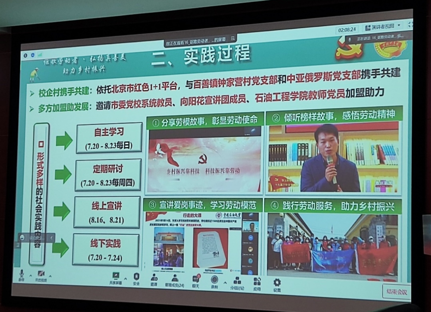 为深入总结经验,树立典型,总结巩固社会实践活动成果,选拔优秀实践团队,8月25日,石油工程学院召开2022年暑期社会实践结题评优答辩会,本次会议邀请了北京市教工委宣传教育处干部王宇航,北京团市委大学中专工作部干部苗天,beat365唯一官方网站(北京)经济管理学院教师邓秀焕,马克思主义学院副教授杨关玲子,校团委学术科技实践部部长贾庆超担任专家评委,石油工程学院党委副书记刘东东、团委书记肖亚楠出席会议,会议由辅导员刘衡升主持。