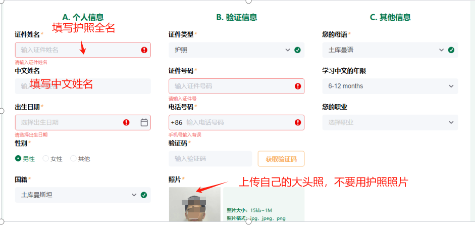 正确填写个人信息,注意,证件姓名填写护照的全名,照片按照正确示例进行拍照