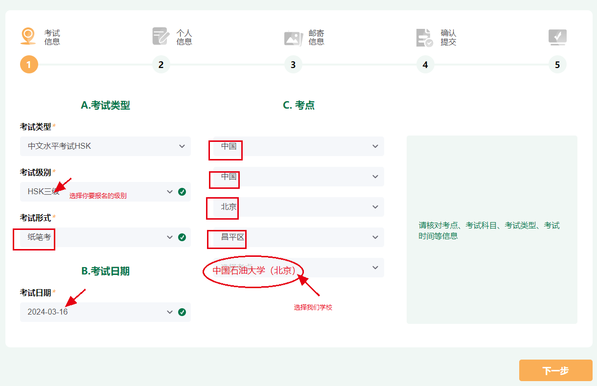步骤二 选择相应的考试类型、考试等级、考试日期等