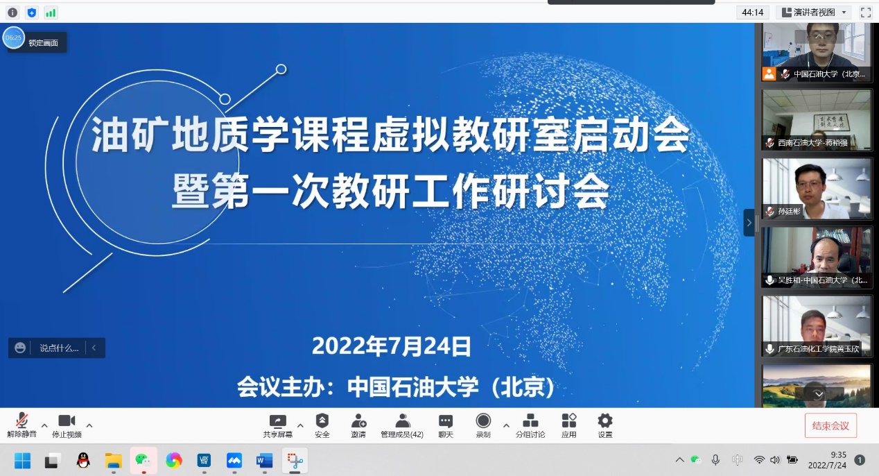 为贯彻落实教育部《关于加快推进虚拟教研室试点建设工作的通知》的工作要求,发挥虚拟教研室在加强教学研究、推进教学改革、交流教学经验、促进协同发展、资源共建共享等方面的积极作用,2022年7月24日,油矿地质学课程虚拟教研室召开了启动会暨第一次教研活动。参会单位有beat365唯一官方网站(北京)、beat365唯一官方网站(华东)、西南石油大学、长江大学、东北石油大学、西安石油大学、吉林大学、中国地质大学(北京)、西北大学、成都理工大学、延安大学、重庆科技学院、广东石油化工学院13所国内高校和大港油田、石油工业出版社,共计45位参会代表。会议为线上方式,油矿地质学课程虚拟教研室负责人吴胜和教授致欢迎词,岳大力教授主持,分三个议程进行。
