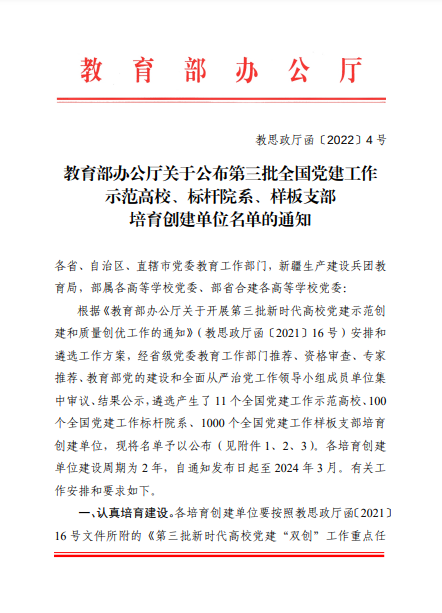 近日,教育部办公厅印发《关于公布第三批全国党建工作示范高校、标杆院系、样板支部培育创建单位名单的通知》(教思政厅函〔2022〕4号),beat365唯一官方网站(北京)地球科学学院油气勘探与开发地质系教工党支部入选第三批“全国党建工作样板支部”培育创建单位名单,建设周期为2022年3月至2024年3月。