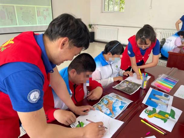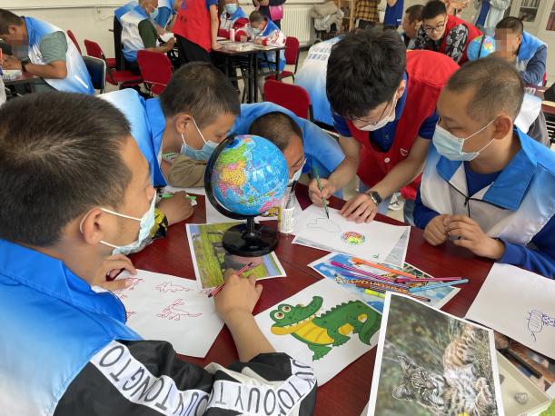 研会志愿者首先对温馨家园的大家长园长翟迪老师中进行了专访,在翟迪园长为志愿者团队介绍了园区的基本情况后,志愿者们对残障人士进行生活帮扶和知识科普。之后,志愿者们一对一的与帮扶对象进行了亲切地交谈,运用地球仪,各类矿石标本、动物图片等道具,分组为残障人士耐心地讲解了地理小知识,并以“我心中的地球”为题鼓励他们进行绘画创作,激发他们的兴趣。在科普和交流活动结束后,地球科学学院研究生会的志愿者们为温馨家园送上了水果,牛奶等爱心物资,并对园区内环境进行了清扫,维持了园区内的整洁卫生。