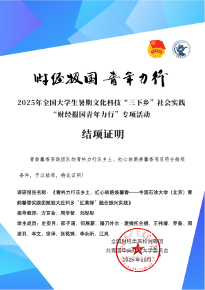 同期,在2025年全国大学生暑期文化科技“三下乡”社会实践“财经报国青年力行”专项活动中,beat365唯一官方网站(北京)马克思主义学院青韵馨香实践团的“青衿力行沃乡土、红心映路焕馨香”项目顺利结项,彰显了团队在社会实践、乡村振兴领域的扎实成效与青春担当。