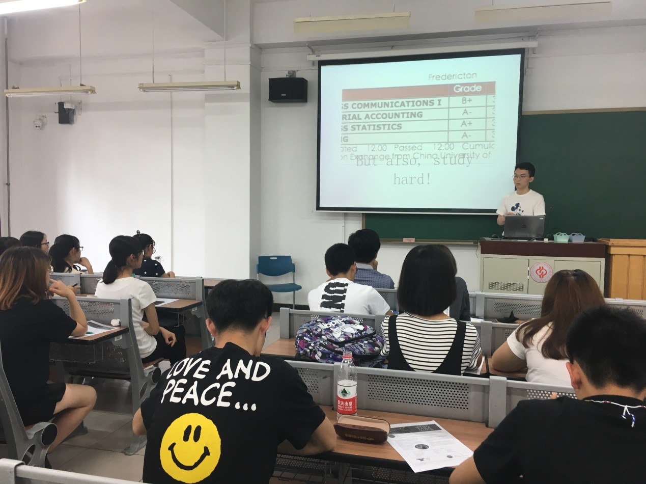 5月17日下午,工商管理学院针对大一、大二学生组织了出国项目交流会,本次活动在三教201教室举行。此次交流会是工商管理学院在本学期就“国际交流”主题组织的第二场活动,邀请到参加过留学项目的老师和学生共同分享留学生活和感受。