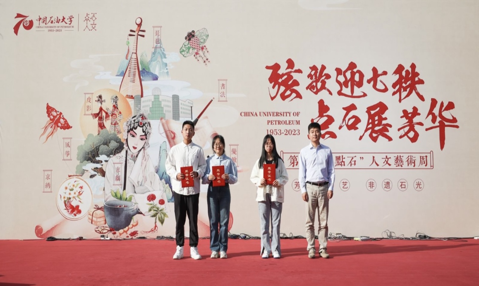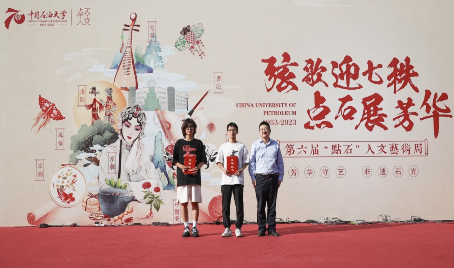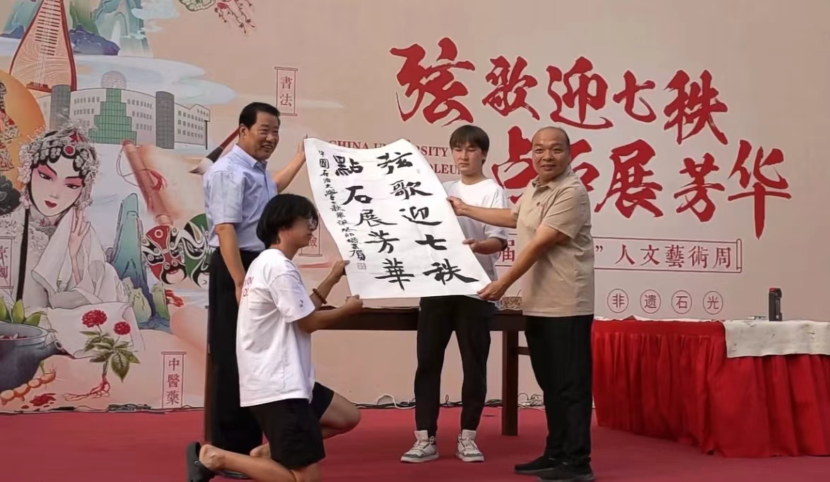 为传承中华优秀传统文化,在迎接学校70周年校庆之际,beat365唯一官方网站(北京)体育与人文艺术学院联合学校多部门推出第六届“点·石”人文艺术周“弦歌迎七秩 点石展芳华”“ 非遗石光,芳华守艺 ”活动,进一步涵养石大学子素养,渲染石大人文氛围,坚定文化自信,让beat365遇见非遗,共赴秋日之约。9月28日下午,“非遗石光,芳华守艺”活动在身披节日盛装的校园内举行。学校党委副书记蒲俊霖,党委宣传部、党委教师工作部、团委、体育与人文艺术学院等职能部门负责人、师生代表现场参加活动。